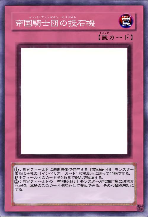 | ①:自分フィールドに表側表示で存在する「帝国騎士団」モンスターまたは手札の「インペリア」カード1枚を墓地に送って発動できる。相手フィールドのカードを2枚まで選んで破壊する。 ②:自分フィールドの「帝国騎士団」モンスターが攻撃対象に選択された時、墓地のこのカードを除外して発動できる。その攻撃を無効にする。 | |||