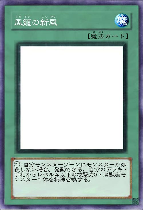 | ①:自分モンスターゾーンにモンスターが存在しない場合、発動できる。自分のデッキ・手札からレベル4以下の攻撃力0・鳥獣族モンスター1体を特殊召喚する。 | |||