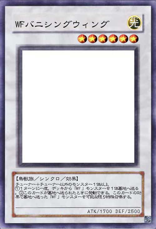 | チューナー+チューナー以外のモンスター1体以上 ①1ターンに一度、デッキから「WF」モンスターを1体墓地へ送る。②このカードが墓地へ送られたときに発動できる。このカードの効果で墓地へ送った「WF」モンスターを可能な限り特殊召喚する。 | |||