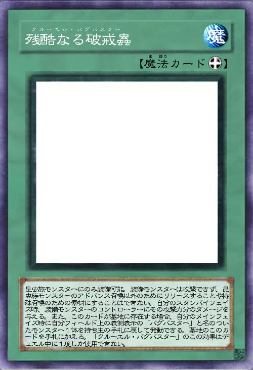 | 昆虫族モンスターにのみ装備可能。装備モンスターは攻撃できず、昆虫族モンスターのアドバンス召喚以外のためにリリースすることや特殊召喚のための素材にすることはできない。自分のスタンバイフェイズ時、装備モンスターのコントローラーにその攻撃力分のダメージを与える。また、このカードが墓地に存在する場合、自分のメインフェイズ時に自分フィールド上の表側表示の「バグバスター」と名のついたモンスター1体を持ち主の手札に戻して発動できる。墓地のこのカードを手札に加える。「クルーエル・バグバスター」のこの効果はデュエル中に1度しか使用できない。 | |||