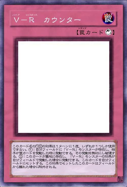 | このカード名の①②の効果は1ターンに1度、いずれか1つしか使用できない。①:自分フィールドに「V-R」モンスターが存在し、相手が罠カードを発動した時に発動できる。その発動を無効にし破壊する。②:このカードが墓地に存在し、「V-R」モンスターの効果が自分フィールドで発動した場合に発動できる。このカードを自分フィールドにセットする。この効果でセットしたこのカードはフィールドから離れた場合に除外される。 | |||