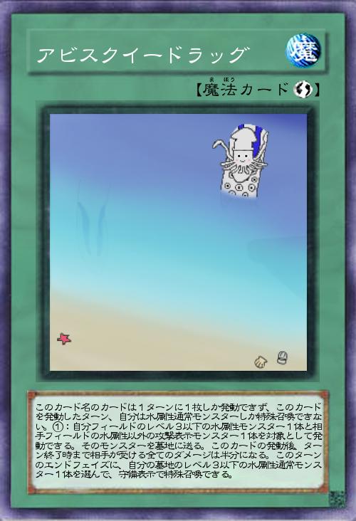 互いに墓地送りという強力な効果に加えて、エンドにはバニラの蘇生も行えるのでより強力な速攻魔法。制約もなかなかですが、それを込みでも強力な速攻魔法になっておりますね~。引きずり込むイカは一体どんなイカなのか…?子供は結構マスコット感があるので、意外とビッグなマスコットなイカなのかもしれない?にしても深淵に引きずり込むのはイカんですよ。」(2019-02-08 00:45)