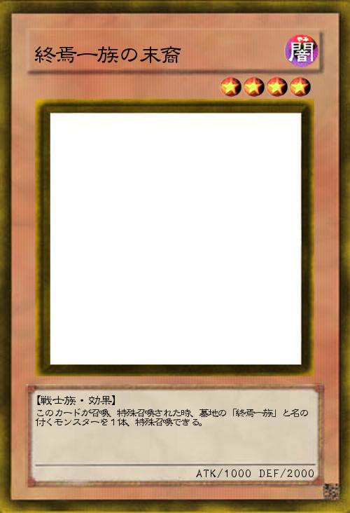 | このカードが召喚、特殊召喚された時、墓地の「終焉一族」と名の付くモンスターを1体、特殊召喚できる。 | |||