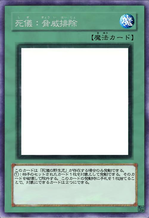 | このカードは「死儀の野生児」が存在する場合のみ発動できる。 ①:相手のセットされたカード1枚を対象として発動できる。そのカードを破壊して除外する。このカードの発動時に手札を1枚捨てることで、対象にできるカードは2つにできる。 | |||