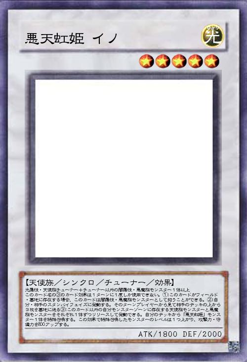 | 光属性・天使族チューナー+チューナー以外の闇属性・悪魔族モンスター1体以上 このカード名の③のカード効果は1ターンに1度しか使用できない。①:このカードがフィールド・墓地に存在する場合、このカードは闇属性・悪魔族モンスターとして扱うことができる。②:自分・相手のスタンバイフェイズに発動する。そのターンプレイヤーから見て相手のデッキの上から3枚を墓地に送る③:このカード以外の自分モンスターゾーンに存在する天使族モンスターと悪魔族モンスターをそれぞれ1体ずつリリースして発動できる。自分のデッキから「悪天虹姫」モンスター1体を特殊召喚する。この効果で特殊召喚したモンスターのレベルは1つ上がり、攻撃力・守備力を800アップする。 | |||
