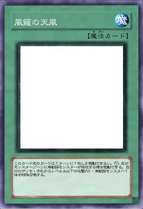 | このカード名のカードは1ターンに1枚しか発動できない。①:自分モンスターゾーンに鳥獣族モンスターが存在する場合発動できる。自分のデッキ・手札からレベル4以下の攻撃力0・鳥獣族モンスター1体を特殊召喚する。 | |||