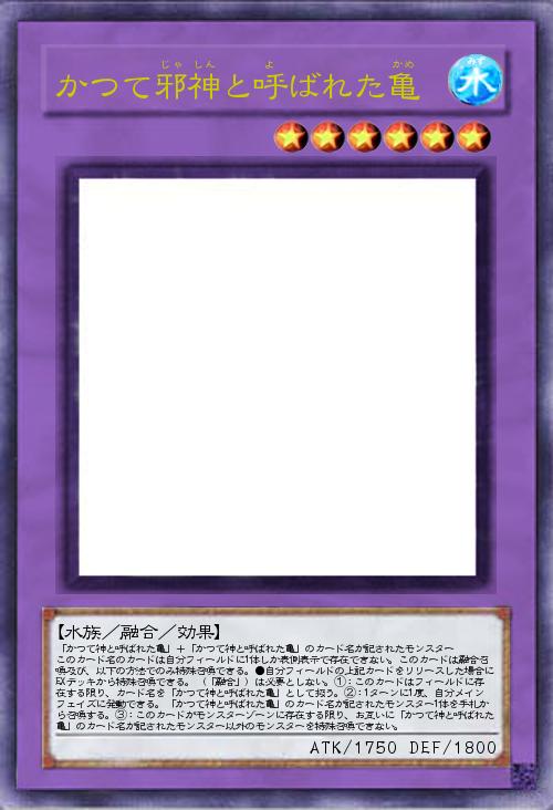 | 「かつて神と呼ばれた亀」+「かつて神と呼ばれた亀」のカード名が記されたモンスター このカード名のカードは自分フィールドに1体しか表側表示で存在できない。このカードは融合召喚及び、以下の方法でのみ特殊召喚できる。●自分フィールドの上記カードをリリースした場合にEXデッキから特殊召喚できる。(「融合」)は必要としない。①:このカードはフィールドに存在する限り、カード名を「かつて神と呼ばれた亀」として扱う。②:1ターンに1度、自分メインフェイズに発動できる。「かつて神と呼ばれた亀」のカード名が記されたモンスター1体を手札から召喚する。③:このカードがモンスターゾーンに存在する限り、お互いに「かつて神と呼ばれた亀」のカード名が記されたモンスター以外のモンスターを特殊召喚できない。 | |||