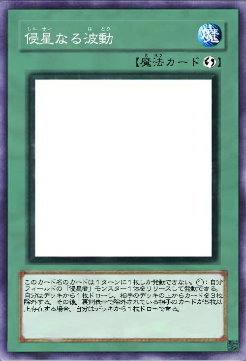 | このカード名のカードは1ターンに1枚しか発動できない。①:自分フィールドの「侵星者」モンスター1体をリリースして発動できる。自分はデッキから1枚ドローし、相手のデッキの上からカードを3枚除外する。その後、裏側表示で除外されている相手のカードが5枚以上存在する場合、自分はデッキから1枚ドローできる。 | |||