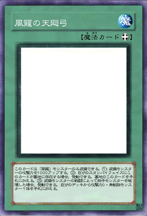 | このカードは「風籠」モンスターのみ装備できる。①:装備モンスターの攻撃力を1000アップする。②:自分のスタンバイフェイズにこのカードが墓地に存在する場合、発動できる。墓地のこのカードを手札に加える。③:装備モンスターの戦闘によって相手モンスターを破壊した場合、発動できる。自分のデッキから攻撃力0・鳥獣族モンスター1体を手札に加える。 | |||