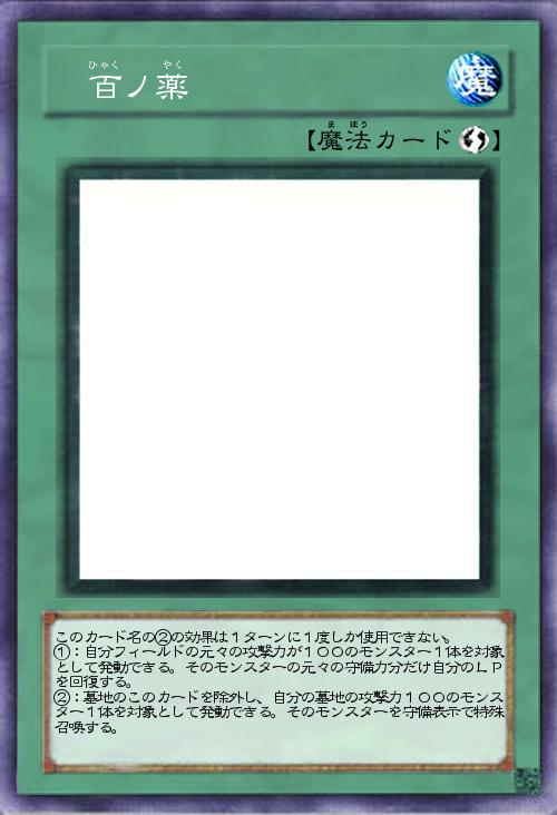 | このカード名の②の効果は1ターンに1度しか使用できない。 ①:自分フィールドの元々の攻撃力が100のモンスター1体を対象として発動できる。そのモンスターの元々の守備力分だけ自分のLPを回復する。 ②:墓地のこのカードを除外し、自分の墓地の攻撃力100のモンスター1体を対象として発動できる。そのモンスターを守備表示で特殊召喚する。 | |||