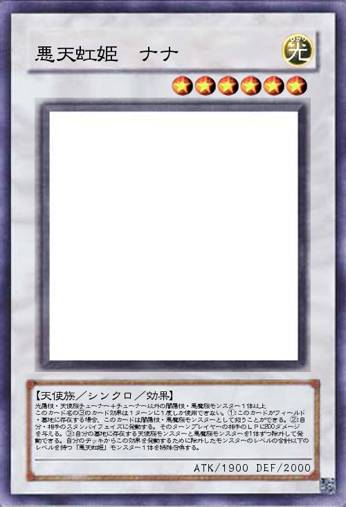 | 光属性・天使族チューナー+チューナー以外の闇属性・悪魔族モンスター1体以上 このカード名の③のカード効果は1ターンに1度しか使用できない。①:このカードがフィールド・墓地に存在する場合、このカードは闇属性・悪魔族モンスターとして扱うことができる。②:自分・相手のスタンバイフェイズに発動する。そのターンプレイヤーの相手のLPに800ダメージを与える。③:自分の墓地に存在する天使族モンスターと悪魔族モンスターを1体ずつ除外して発動できる。自分のデッキからこの効果を発動するために除外したモンスターのレベルの合計以下のレベルを持つ「悪天虹姫」モンスター1体を特殊召喚する。 | |||