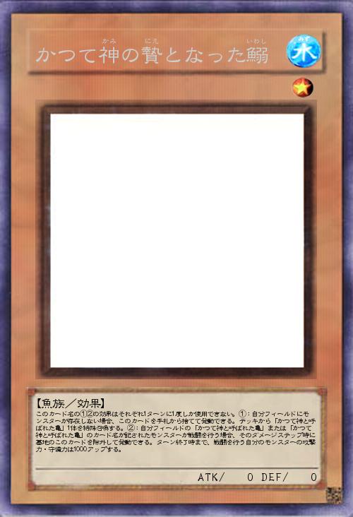 | このカード名の①②の効果はそれぞれ1ターンに1度しか使用できない。①:自分フィールドにモンスターが存在しない場合、このカードを手札から捨てて発動できる。デッキから「かつて神と呼ばれた亀」1体を特殊召喚する。②:自分フィールドの「かつて神と呼ばれた亀」または「かつて神と呼ばれた亀」のカード名が記されたモンスターが戦闘を行う場合、そのダメージステップ時に墓地のこのカードを除外して発動できる。ターン終了時まで、戦闘を行う自分のモンスターの攻撃力・守備力は1000アップする。 | |||