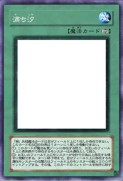 | 「潮」永続魔法カードは自分フィールド上に1枚しか存在できない。このカード名の②の効果は1ターンに1度しか発動できない。 ①:このカードが魔法&罠ゾーンに存在する限り、お互いのフィールド上に表側表示で存在するモンスターは水属性として扱う。 ②:お互いのフィールド上にモンスターが合計で5体以上存在する場合に発動できる。ターン終了時まで、自分フィールド上に存在する水属性モンスターの攻撃力はフィールド上のモンスターの数×200ポイントアップする。その後、このカードのコントロールを相手に移す。 | |||