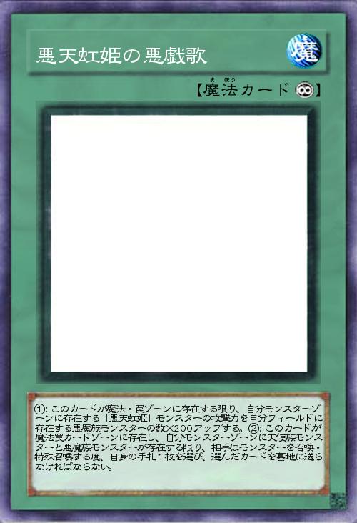 | ①:このカードが魔法・罠ゾーンに存在する限り、自分モンスターゾーンに存在する「悪天虹姫」モンスターの攻撃力を自分フィールドに存在する悪魔族モンスターの数×200アップする。②:このカードが魔法罠カードゾーンに存在し、自分モンスターゾーンに天使族モンスターと悪魔族モンスターが存在する限り、相手はモンスターを召喚・特殊召喚する度、自身の手札1枚を選び、選んだカードを墓地に送らなければならない。 | |||