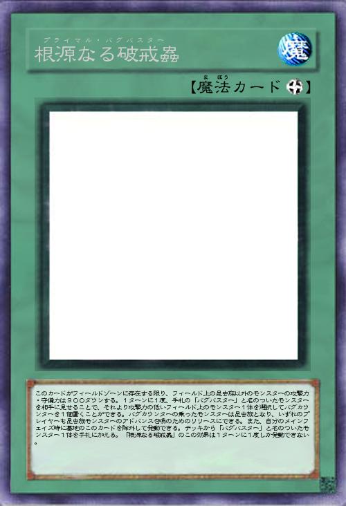 | このカードがフィールドゾーンに存在する限り、フィールド上の昆虫族以外のモンスターの攻撃力・守備力は300ダウンする。1ターンに1度、手札の「バグバスター」と名のついたモンスターを相手に見せることで、それより攻撃力の低いフィールド上のモンスター1体を選択してバグカウンターを1個置くことができる。バグカウンターの乗ったモンスターは昆虫族となり、いずれのプレイヤーも昆虫族モンスターのアドバンス召喚のためのリリースにできる。また、自分のメインフェイズ時に墓地のこのカードを除外して発動できる。デッキから「バグバスター」と名のついたモンスター1体を手札に加える。「根源なる破戒蟲」のこの効果は1ターンに1度しか発動できない。 | |||