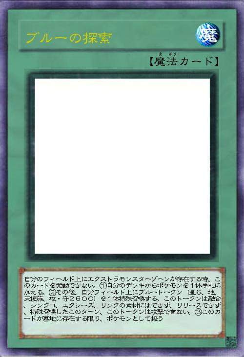 | 自分のフィールド上にエクストラモンスターゾーンが存在する時、このカードを発動できない。①自分のデッキからポケモンを1体手札に加える。②その後、自分フィールド上にブルートークン(星6、地、天使族、攻・守2600)を1体特殊召喚する。このトークンは融合、シンクロ、エクシーズ、リンクの素材にはできず、リリースできず、特殊召喚したこのターン、このトークンは攻撃できない。③このカードが墓地に存在する限り、ポケモンとして扱う | |||