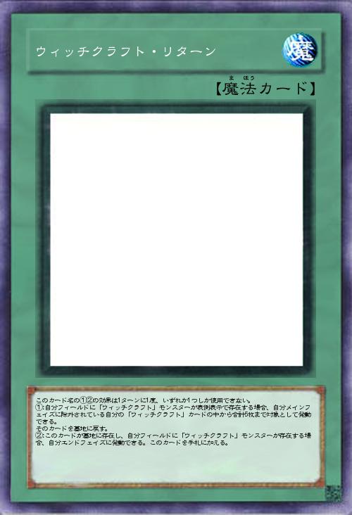 | このカード名の①②の効果は1ターンに1度、いずれか1つしか使用できない。 ①:自分フィールドに「ウィッチクラフト」モンスターが表側表示で存在する場合、自分メインフェイズに除外されている自分の「ウィッチクラフト」カードの中から合計5枚まで対象として発動できる。 そのカードを墓地に戻す。 ②:このカードが墓地に存在し、自分フィールドに「ウィッチクラフト」モンスターが存在する場合、自分エンドフェイズに発動できる。このカードを手札に加える。 | |||
