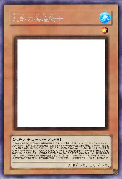 | このカード名の①の方法による特殊召喚は、1ターンに1度しか行えない。①:自分フィールドに元々のカード名が「忘却の海底神殿」となるカードが表側表示で存在する場合、このカードは手札から特殊召喚できる。②:このカードの①の方法で特殊召喚に成功した場合、除外されている自分のモンスターの中から、「忘却の海底神殿」のカード名が記されたモンスター1体を対象として発動できる。そのモンスターを守備表示で特殊召喚する。この効果を発動するターン、自分は水属性SモンスターしかEXデッキから特殊召喚できない。③:モンスターゾーンのこのカードがカードの効果で除外された場合、相手の墓地のカード1枚を対象として発動できる。そのカードを除外する。 | |||