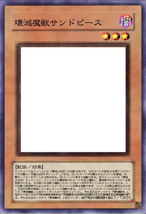 | ①このカードはフィールドの「壊滅土地市」の効果を受けず、そのカードが存在する限りこのカードの攻撃力・守備力は500ポイントアップする。②このカードが攻撃されたダメージ計算後、攻撃モンスターをゲームから除外する。③1ターンに1度まで発動できる。自分フィールドの「壊滅土地市」をリリースし、フィールドの裏側表示のカードを全て確認し、裏側表示のモンスターを表側表示にする。その後この効果で確認したカード1枚につき500ポイントのダメージを与える。この効果で表側表示になったモンスターのリバース効果は発動できず、リバース効果は無効化される。④③の効果を使用していないターンに発動できる。このカードとこのカード以外の自分フィールドの「壊滅魔獣」と名のつくモンスター1体をリリースし、手札またはデッキから「壊滅魔神」と名のつくモンスター1体を特殊召喚する。⑤戦闘または相手の効果によって破壊された時発動できる。手 | |||