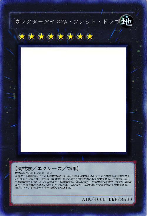 「FA・フォトン・ドラゴンを意識した感じのファット・ドラゴンを作りました。機械族のエクシーズモンスター全般に重ねて出すことができ、対象を取らない除去を行えます。自己再生効果がなくなった代わりに装備カードを身代わりにする効果にしました。」(2019-02-14 09:57)