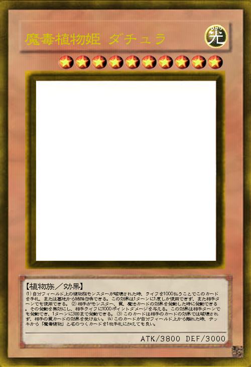 | (1)自分フィールド上の植物族モンスターが破壊された時、ライフを1000払うことでこのカードを手札、または墓地から特殊召喚できる。この効果は1ターンに1度しか使用できず、また相手ターンでも使用できる。(2)相手がモンスター、罠、魔法カードの効果を発動した時に発動できる。その発動を無効にし、相手ライフに1000ポイントダメージを与える。この効果は相手ターンでも発動でき、1ターンに3回まで発動できる。(3)このカードは相手のカードの効果では破壊されず、相手の罠カードの効果を受けない。(4)このカードが自分フィールド上から離れた時、デッキから「魔毒植物」と名のつくカードを1枚手札に加えても良い。 | |||