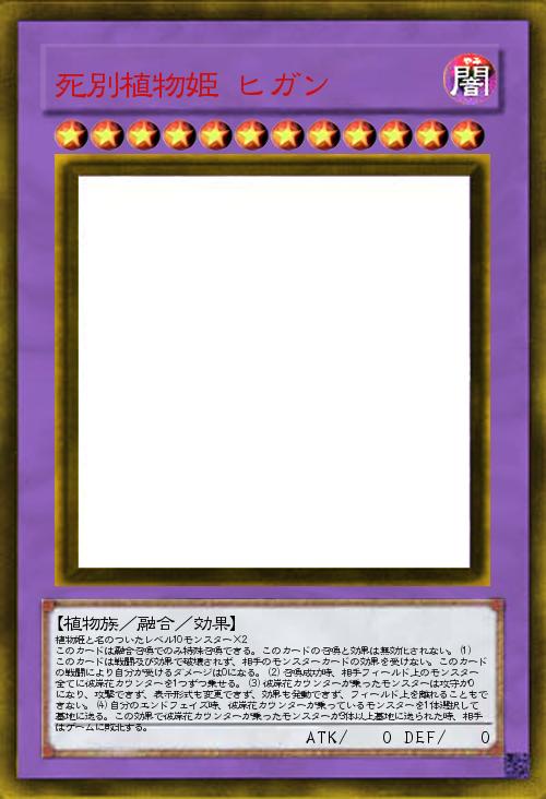 | 植物姫と名のついたレベル10モンスター×2 このカードは融合召喚でのみ特殊召喚できる。このカードの召喚と効果は無効化されない。(1)このカードは戦闘及び効果で破壊されず、相手のモンスターカードの効果を受けない。このカードの戦闘により自分が受けるダメージは0になる。(2)召喚成功時、相手フィールド上のモンスター全てに彼岸花カウンターを1つずつ乗せる。(3)彼岸花カウンターが乗ったモンスターは攻守が0になり、攻撃できず、表示形式も変更できず、効果も発動できず、フィールド上を離れることもできない。(4)自分のエンドフェイズ時、彼岸花カウンターが乗っているモンスターを1体選択して墓地に送る。この効果で彼岸花カウンターが乗ったモンスターが3体以上墓地に送られた時、相手はゲームに敗北する。 | |||