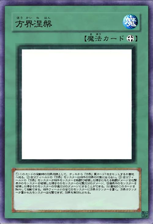 | ①:このカードの発動時の効果処理として、デッキから「方界」罠カード1枚をセットするか墓地へ送る。②:自分フィールドの「方界」モンスターは相手の効果の対象にならない。③:自分フィールドの「方界」モンスターが相手モンスターを戦闘で破壊した場合に与える戦闘ダメージを攻撃表示のモンスターを破壊した場合そのモンスターの攻撃力分のダメージ、守備表示のモンスターを破壊した場合そのモンスターの守備力分のダメージにすることができる。④:墓地のこのカードを除外して発動できる。相手フィールドの全てのモンスターに方界カウンターを置く。方界カウンターが置かれたモンスターは攻撃できず、効果も無効化される。 | |||