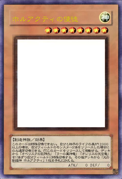 | このカードは特殊召喚できない。自分と相手のライフの差が12000以上の場合、自分フィールドのモンスター3体をリリースした場合にのみ通常召喚できる。①このカードをリリースして発動する。デッキから「オベリスクの巨神兵」「ラーの翼神竜」「オシリスの天空竜」を1体ずつ自分フィールドに特殊召喚する。その後デッキから「光の創造神 ホルアクティ」1枚を手札に加える。 | |||