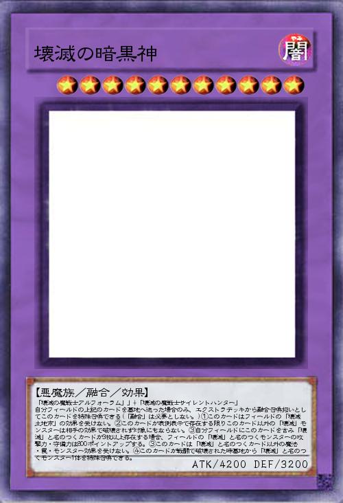 | 「壊滅の魔戦士アルフォーラム」」+「壊滅の魔戦士サイレントハンター」 自分フィールドの上記のカードを墓地へ送った場合のみ、エクストラデッキから融合召喚扱いとしてこのカードを特殊召喚できる(「融合」は必要としない。)①このカードはフィールドの「壊滅土地市」の効果を受けない。②このカードが表側表示で存在する限りこのカード以外の「壊滅」モンスターは相手の効果で破壊されず対象にもならない。③自分フィールドにこのカードを含み「壊滅」と名のつくカードが3枚以上存在する場合、フィールドの「壊滅」と名のつくモンスターの攻撃力・守備力は800ポイントアップする。③このカードは「壊滅」と名のつくカード以外の魔法・罠・モンスター効果を受けない。④このカードが戦闘で破壊された時墓地から「壊滅」と名のつくモンスター1体を特殊召喚できる。 | |||