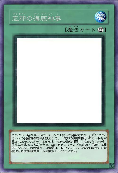 | このカード名のカードは1ターンに1枚しか発動できない。①:このカードの発動時の効果処理として、「忘却の海底神殿」のカード名が記されたモンスター1体または「忘却の海底神殿」1枚をデッキから手札に加えることができる。②:自分フィールドの水族・魚族・海竜族モンスターの攻撃力・守備力は、自分フィールドの表側表示の永続魔法または永続罠カードの数×100アップする。 | |||