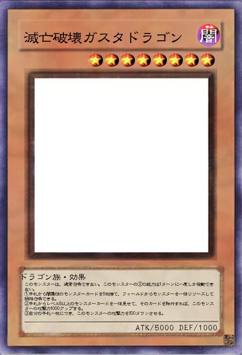 | このモンスターは、通常召喚できない。このモンスターの②の能力は1ターンに一度しか発動できない。 ①手札から闇属性のモンスターカードを5枚捨て、フィールドからモンスターを一体リリースして特殊召喚できる。 ②手札からレベル5以上のモンスターカードを一体見せて、そのカードを除外すれば、このモンスターの攻撃力1000アップする。 ③自分の手札一枚につき、このモンスターの攻撃力を500ダウンさせる。 | |||