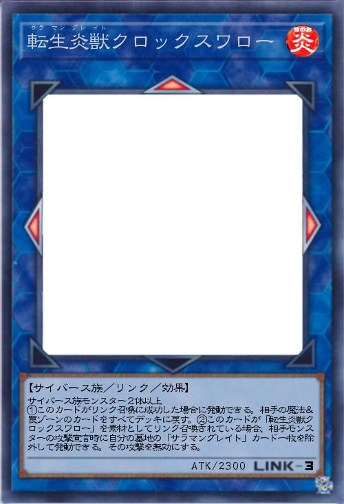 | サイバース族モンスター2体以上 ①このカードがリンク召喚に成功した場合に発動できる。相手の魔法&罠ゾーンのカードをすべてデッキに戻す。②このカードが「転生炎獣クロックスワロー」を素材としてリンク召喚されている場合、相手モンスターの攻撃宣言時に自分の墓地の「サラマングレイト」カード一枚を除外して発動できる。その攻撃を無効にする。 | |||