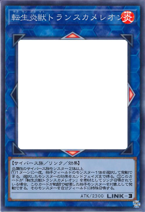 | 炎属性のサイバース族モンスター2体以上 ①1ターンに一度、相手フィールドのモンスター1体を選択して発動できる。選択したモンスターの効果をエンドフェイズまで得る。②このカードが「転生炎獣トランスカメレオン」を素材としてリンク召喚されている場合、このカードが戦闘で破壊した相手モンスターを対象として発動できる。そのモンスターを自分フィールドに特殊召喚する。 | |||
