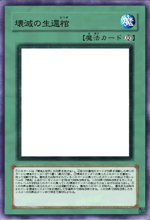 | ①このカードは「壊滅土地市」の効果を受けない。②自分の墓地のカードが効果を発動した時このカードに壊滅カウンターを1つ置く(最大12個)。③壊滅カウンターの乗ったこのカードを墓地へ送って発動できる。墓地または除外されているこのカードに乗っていたカウンターの数より低いレベルの「壊滅」と名のつくモンスターを3体まで特殊召喚する。この効果で特殊召喚するモンスターのレベルの合計はこのカードに乗っていた壊滅カウンターの数より少なくなければならない。④この効果は墓地へ送られたターンには発動できない。墓地のこのカードを除外し、墓地または除外されている壊滅モンスター1体を選択して守備表示で特殊召喚できる。この効果で特殊召喚したモンスターの効果はターン終了時まで無効化される。 | |||