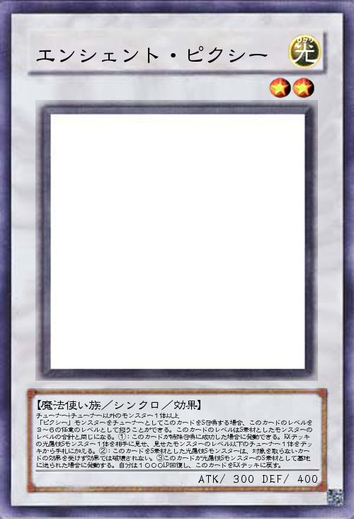 | チューナー+チューナー以外のモンスター1体以上 「ピクシー」モンスターをチューナーとしてこのカードをS召喚する場合、このカードのレベルを3~6の任意のレベルとして扱うことができる。このカードのレベルはS素材としたモンスターのレベルの合計と同じになる。①:このカードが特殊召喚に成功した場合に発動できる。EXデッキの光属性Sモンスター1体を相手に見せ、見せたモンスターのレベル以下のチューナー1体をデッキから手札に加える。②:このカードをS素材とした光属性Sモンスターは、対象を取らないカードの効果を受けず効果では破壊されない。③このカードが光属性SモンスターのS素材として墓地に送られた場合に発動する。自分は1000LP回復し、このカードをEXデッキに戻す。 | |||