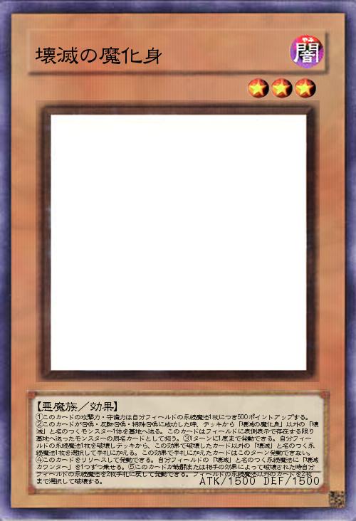| ①このカードの攻撃力・守備力は自分フィールドの永続魔法1枚につき500ポイントアップする。②このカードが召喚・反転召喚・特殊召喚に成功した時、デッキから「壊滅の魔化身」以外の「壊滅」と名のつくモンスター1体を墓地へ送る。このカードはフィールドに表側表示で存在する限り墓地へ送ったモンスターの同名カードとして扱う。③1ターンに1度まで発動できる。自分フィールドの永続魔法1枚を破壊しデッキから、この効果で破壊したカード以外の「壊滅」と名のつく永続魔法1枚を選択して手札に加える。この効果で手札に加えたカードはこのターン発動できない。④このカードをリリースして発動できる。自分フィールドの「壊滅」と名のつく永続魔法に「壊滅カウンター」を1つずつ乗せる。⑤このカードが戦闘または相手の効果によって破壊された時自分フィールドの永続魔法を2枚手札に戻して発動できる。フィールドの永続魔法以外のカードを2枚まで選 | |||
