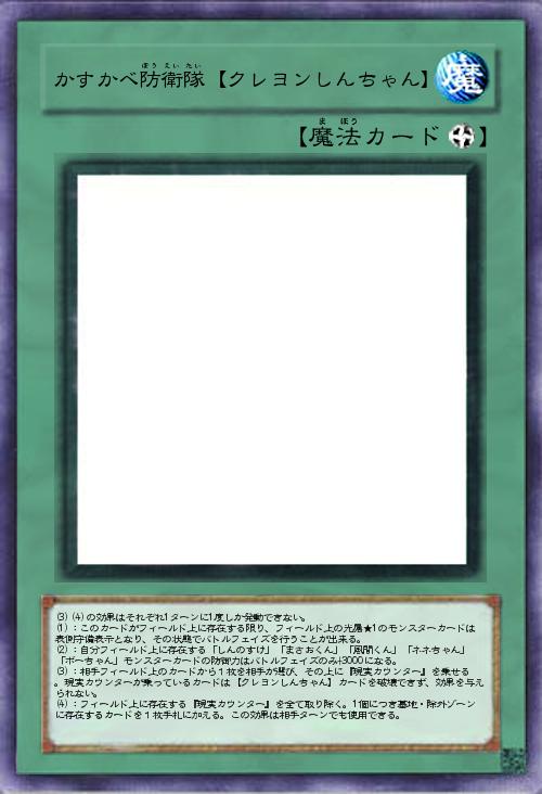 | (3)(4)の効果はそれぞれ1ターンに1度しか発動できない。 (1):このカードがフィールド上に存在する限り、フィールド上の光属★1のモンスターカードは表側守備表示となり、その状態でバトルフェイズを行うことが出来る。 (2):自分フィールド上に存在する「しんのすけ」「まさおくん」「風間くん」「ネネちゃん」「ボーちゃん」モンスターカードの防御力はバトルフェイズのみ+3000になる。 (3):相手フィールド上のカードから1枚を相手が選び、その上に『現実カウンター』を乗せる。現実カウンターが乗っているカードは【クレヨンしんちゃん】カードを破壊できず、効果を与えられない。 (4):フィールド上に存在する『現実カウンター』を全て取り除く。1個につき墓地・除外ゾーンに存在するカードを1枚手札に加える。この効果は相手ターンでも使用できる。 | |||
