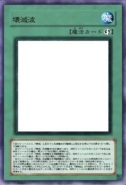 | ①自分フィールドに「壊滅」と名のつく永続魔法が2種類以上存在する時以下の効果から1つ選んで発動できる。 ・自分フィールドの「壊滅」永続魔法1枚を墓地へ送り、相手フィールドのモンスター1体または相手フィールドの魔法・罠カード1枚を選択し破壊する。 ・自分フィールドの「壊滅」永続魔法を2種類墓地へ送り、相手フィールドのモンスター1体と相手フィールドの魔法・罠カード1枚を選択して破壊する。 ・自分フィールドの「壊滅」永続魔法を3種類墓地へ送り、相手フィールドの表側表示モンスターを全て破壊する。この効果を使用したターン自分はモンスターを召喚・特殊召喚できない。 ②この効果は墓地へ送られたターンには発動できない。墓地のこのカードを除外し、デッキから「壊滅波」を1枚選択して手札に加える。③このカードを含む「壊滅波」が3枚除外されている時そのカードを全て墓地またはデッキに戻して発動できる。相手フィールド | |||