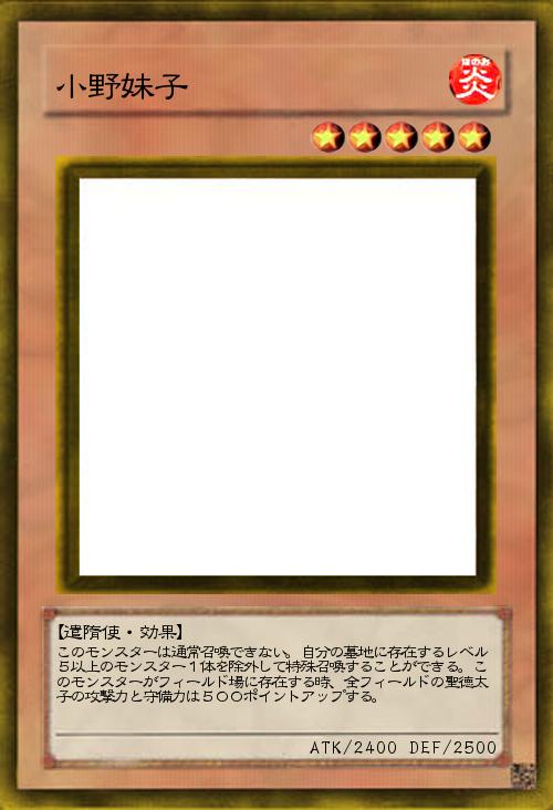 | このモンスターは通常召喚できない。自分の墓地に存在するレベル5以上のモンスター1体を除外して特殊召喚することができる。このモンスターがフィールド場に存在する時、全フィールドの聖徳太子の攻撃力と守備力は500ポイントアップする。 | |||