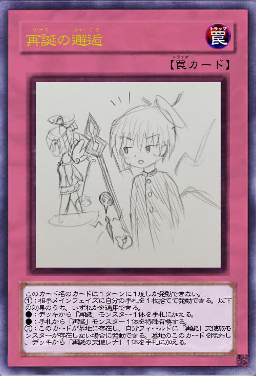 | このカード名のカードは1ターンに1度しか発動できない。 ①:相手メインフェイズに自分の手札を1枚捨てて発動できる。以下の効果のうち、いずれかを適用できる。 ●:デッキから「再誕」モンスター1体を手札に加える。 ●:手札から「再誕」モンスター1体を特殊召喚する。 ②:このカードが墓地に存在し、自分フィールドに「再誕」天使族モンスターが存在しない場合に発動できる。墓地のこのカードを除外し、デッキから「再誕の天使レナ」1体を手札に加える。 | |||
