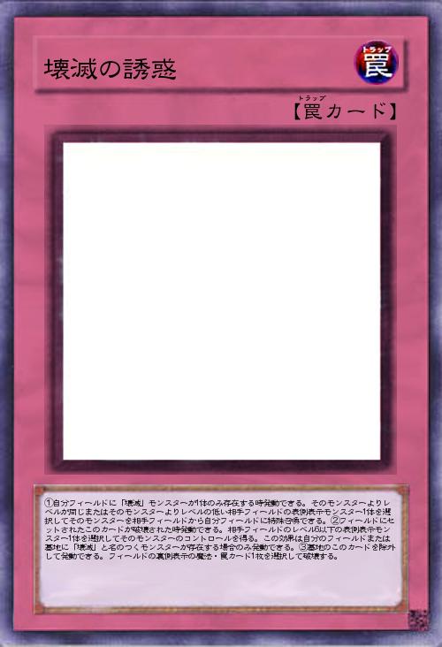 | ①自分フィールドに「壊滅」モンスターが1体のみ存在する時発動できる。そのモンスターよりレベルが同じまたはそのモンスターよりレベルの低い相手フィールドの表側表示モンスター1体を選択してそのモンスターを相手フィールドから自分フィールドに特殊召喚できる。②フィールドにセットされたこのカードが破壊された時発動できる。相手フィールドのレベル6以下の表側表示モンスター1体を選択してそのモンスターのコントロールを得る。この効果は自分のフィールドまたは墓地に「壊滅」と名のつくモンスターが存在する場合のみ発動できる。③墓地のこのカードを除外して発動できる。フィールドの裏側表示の魔法・罠カード1枚を選択して破壊する。 | |||