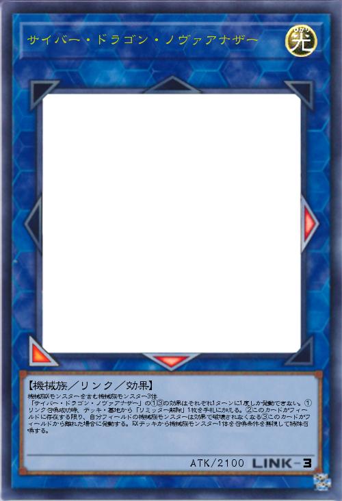 | 機械族Xモンスターを含む機械族モンスター3体 「サイバー・ドラゴン・ノヴァアナザー」の①③の効果はそれぞれ1ターンに1度しか発動できない。①リンク召喚成功時、デッキ・墓地から「リミッター解除」1枚を手札に加える。②このカードがフィールドに存在する限り、自分フィールドの機械族モンスターは効果で破壊されなくなる③このカードがフィールドから離れた場合に発動する。EXデッキから機械族モンスター1体を召喚条件を無視して特殊召喚する。 | |||