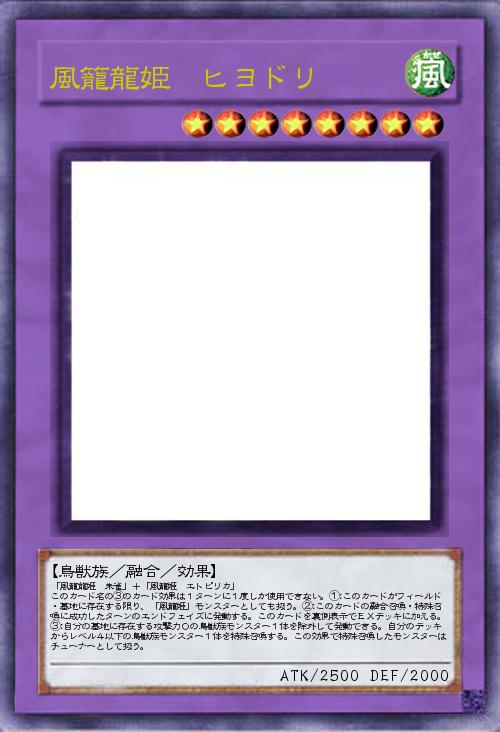 | 「風籠龍姫 朱雀」+「風籠姫 エトピリカ」 このカード名の③のカード効果は1ターンに1度しか使用できない。①:このカードがフィールド・墓地に存在する限り、「風籠姫」モンスターとしても扱う。②:このカードの融合召喚・特殊召喚に成功したターンのエンドフェイズに発動する。このカードを裏側表示でEXデッキに加える。③:自分の墓地に存在する攻撃力0の鳥獣族モンスター1体を除外して発動できる。自分のデッキからレベル4以下の鳥獣族モンスター1体を特殊召喚する。この効果で特殊召喚したモンスターはチューナーとして扱う。 | |||