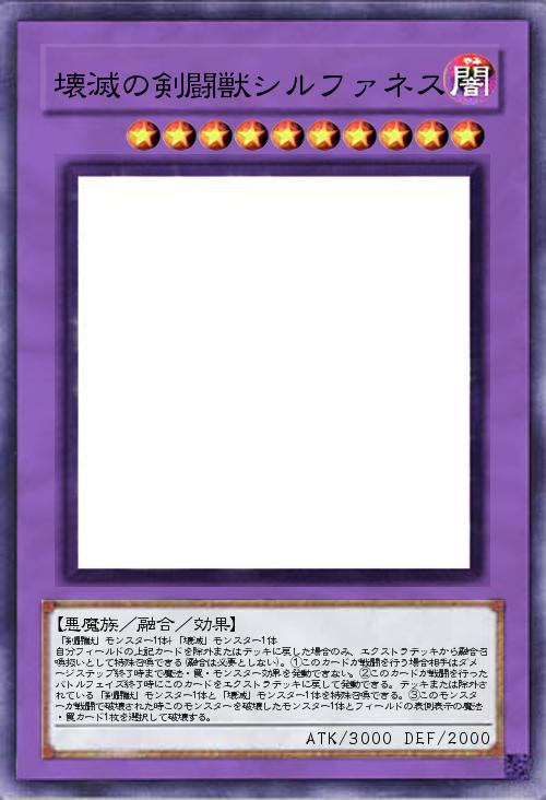 | 「剣闘獣」モンスター1体+「壊滅」モンスター1体 自分フィールドの上記カードを除外またはデッキに戻した場合のみ、エクストラデッキから融合召喚扱いとして特殊召喚できる(融合は必要としない)。①このカードが戦闘を行う場合相手はダメージステップ終了時まで魔法・罠・モンスター効果を発動できない。②このカードが戦闘を行ったバトルフェイズ終了時にこのカードをエクストラデッキに戻して発動できる。デッキまたは除外されている「剣闘獣」モンスター1体と「壊滅」モンスター1体を特殊召喚できる。③このモンスターが戦闘で破壊された時このモンスターを破壊したモンスター1体とフィールドの表側表示の魔法・罠カード1枚を選択して破壊する。 | |||