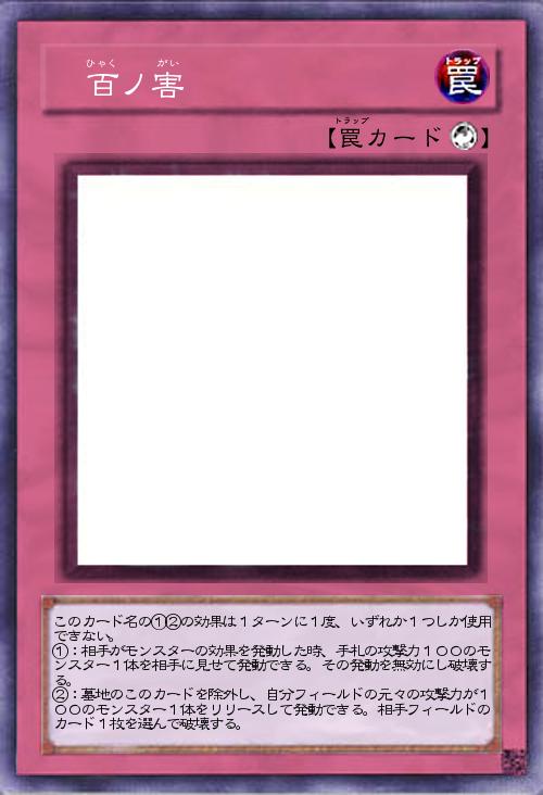 モンスター限定ですが、緩い条件で発動できるカウンター罠です。カテゴリ外でも使用できるレベルの緩さ、かつ墓地効果により追加で場を荒らすこともできる、名の通りの害を持つカードです。攻撃力100のモンスターを見せますがこのカードは「一ノ白」カードではないので、白面などのトリガーになることはできない所は注意。」(2019-02-24 13:55)