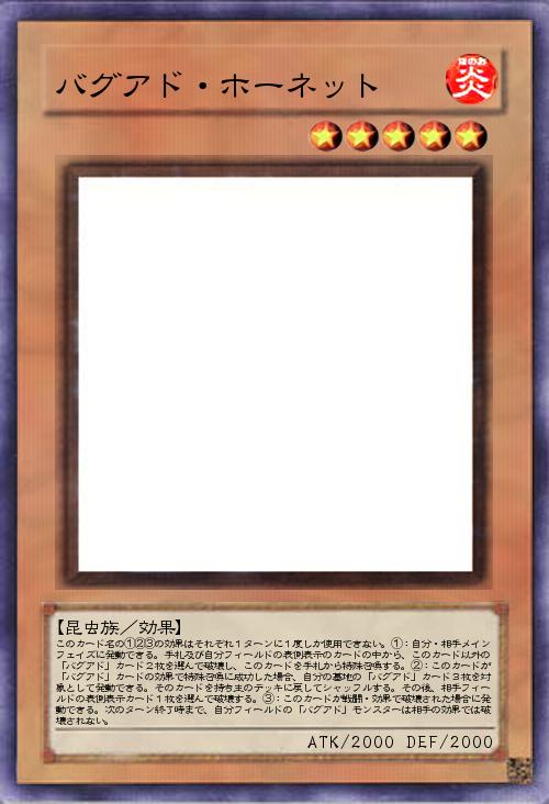 | このカード名の①②③の効果はそれぞれ1ターンに1度しか使用できない。①:自分・相手メインフェイズに発動できる。手札及び自分フィールドの表側表示のカードの中から、このカード以外の「バグアド」カード2枚を選んで破壊し、このカードを手札から特殊召喚する。②:このカードが「バグアド」カードの効果で特殊召喚に成功した場合、自分の墓地の「バグアド」カード3枚を対象として発動できる。そのカードを持ち主のデッキに戻してシャッフルする。その後、相手フィールドの表側表示カード1枚を選んで破壊する。③:このカードが戦闘・効果で破壊された場合に発動できる。次のターン終了時まで、自分フィールドの「バグアド」モンスターは相手の効果では破壊されない。 | |||
