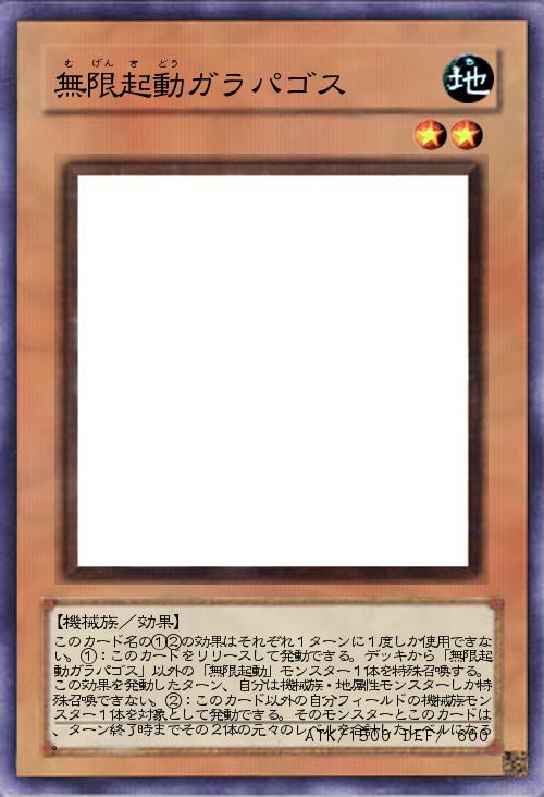 | このカード名の①②の効果はそれぞれ1ターンに1度しか使用できない。①:このカードをリリースして発動できる。デッキから「無限起動ガラパゴス」以外の「無限起動」モンスター1体を特殊召喚する。この効果を発動したターン、自分は機械族・地属性モンスターしか特殊召喚できない。②:このカード以外の自分フィールドの機械族モンスター1体を対象として発動できる。そのモンスターとこのカードは、ターン終了時までその2体の元々のレベルを合計したレベルになる。 | |||