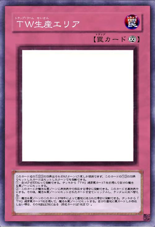 | このカード名の①②③の効果はそれぞれ1ターンに1度しか使用できず、このカードの①③の効果でセットしたカードはセットしたターンでも発動できる。 ①:自分LPを500払って発動できる。デッキから「TW」通常罠カード1枚を選んで自分の魔法&罠ゾーンにセットする。 ②:このカードが魔法&罠ゾーンに表側表示で存在する場合に発動できる。このカードを裏側表示にする。その後、魔法&罠ゾーンにセットされたカードを全てシャッフルし、ランダムに並べ替える。 ③:魔法&罠ゾーンのこのカードが相手によって墓地に送られた場合に発動できる。デッキから「TW」通常罠カード1枚を選んで、魔法&罠ゾーンにセットする。自分の墓地に罠カードしか存在しない場合、その枚数は2枚になる(同名カードは1枚まで)。 | |||