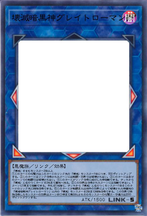 | 「壊滅」を含むモンスター2体以上 ①このカードの攻撃力はこのカードのリンク先の「壊滅」モンスター1体につき、500ポイントアップする。②このカードはリンク召喚されたターンには戦闘・効果では破壊されない。③このカードは自分のターンでの戦闘では破壊されない。④このカードがリンク召喚に成功した時発動できる。デッキから「壊滅」と名のつくカードを2枚まで墓地へ送る。⑤この効果は召喚されたターンには発動できない。1ターンに1度まで発動できる。手札を1枚捨て、デッキから「壊滅」と名のつくモンスター1体をこのカードのリンク先に特殊召喚できる。⑥このカードが戦闘または相手の効果によって破壊された時墓地の「壊滅暗黒神グレイトローマン」以外の「壊滅」モンスターを2体まで特殊召喚できる。この効果で特殊召喚したモンスターの効果はターン終了時まで無効化されそのモンスターの攻撃力・守備力は2000ポイントダウンする。 | |||