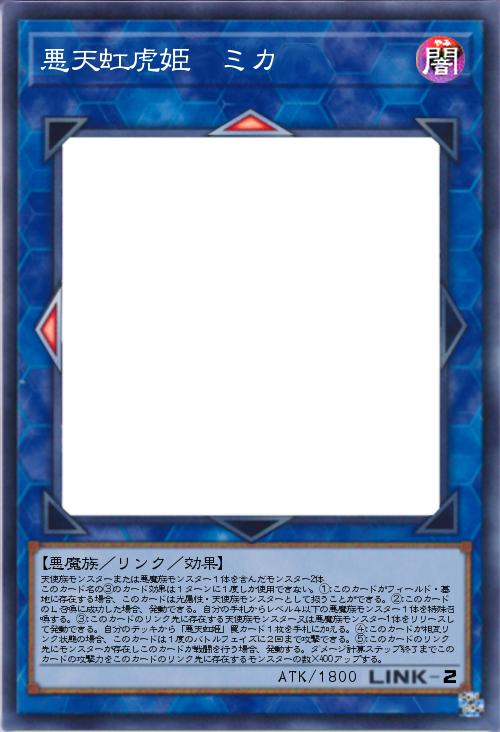 | 天使族モンスターまたは悪魔族モンスター1体を含んだモンスター2体 このカード名の③のカード効果は1ターンに1度しか使用できない。①:このカードがフィールド・墓地に存在する場合、このカードは光属性・天使族モンスターとして扱うことができる。②:このカードのL召喚に成功した場合、発動できる。自分の手札からレベル4以下の悪魔族モンスター1体を特殊召喚する。③:このカードのリンク先に存在する天使族モンスター又は悪魔族モンスター1体をリリースして発動できる。自分のデッキから「悪天虹姫」罠カード1枚を手札に加える。④:このカードが相互リンク状態の場合、このカードは1度のバトルフェイズに2回まで攻撃できる。⑤:このカードのリンク先にモンスターが存在しこのカードが戦闘を行う場合、発動する。ダメージ計算ステップ終了までこのカードの攻撃力をこのカードのリンク先に存在するモンスターの数×400アップする。 | |||